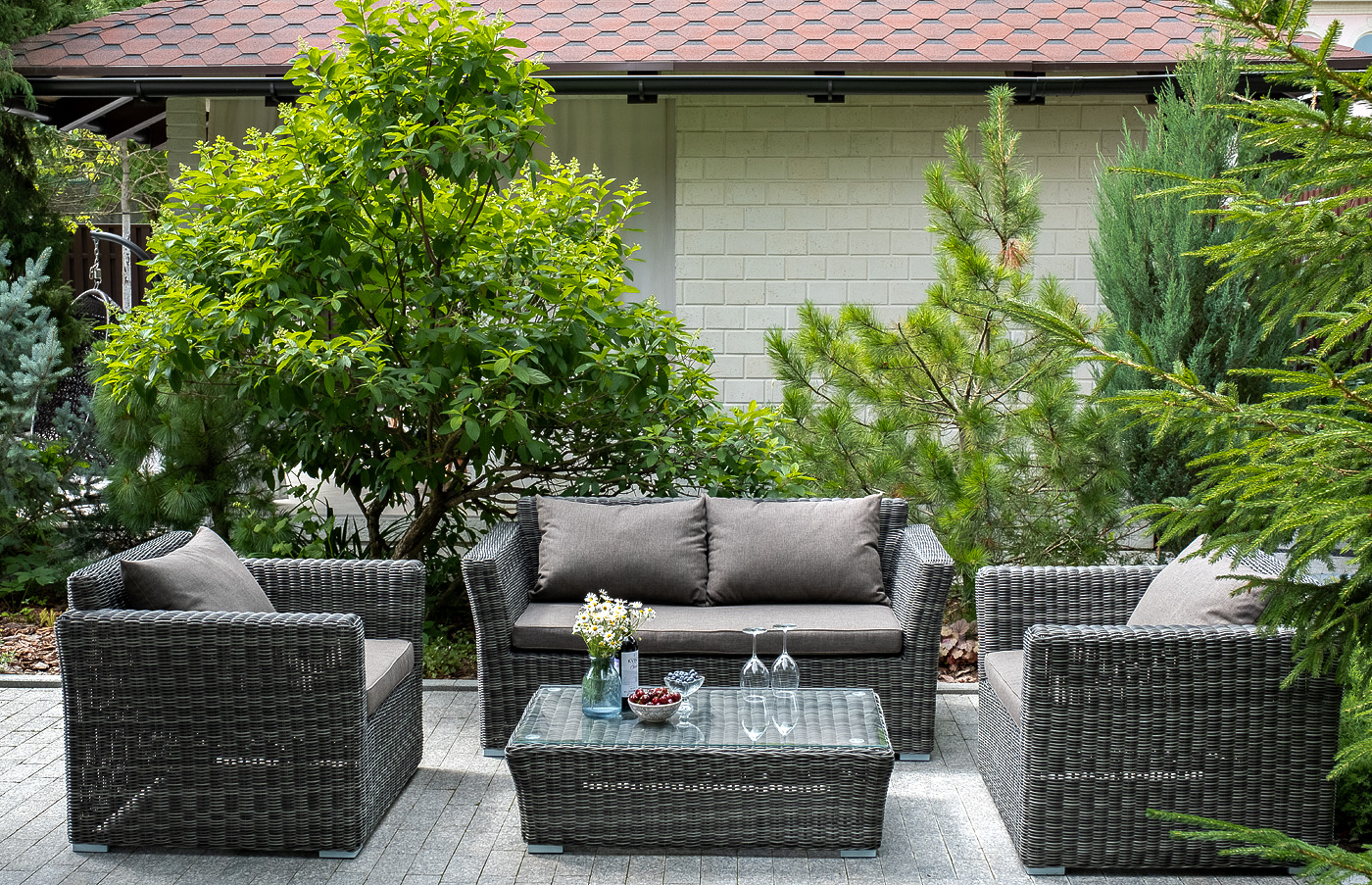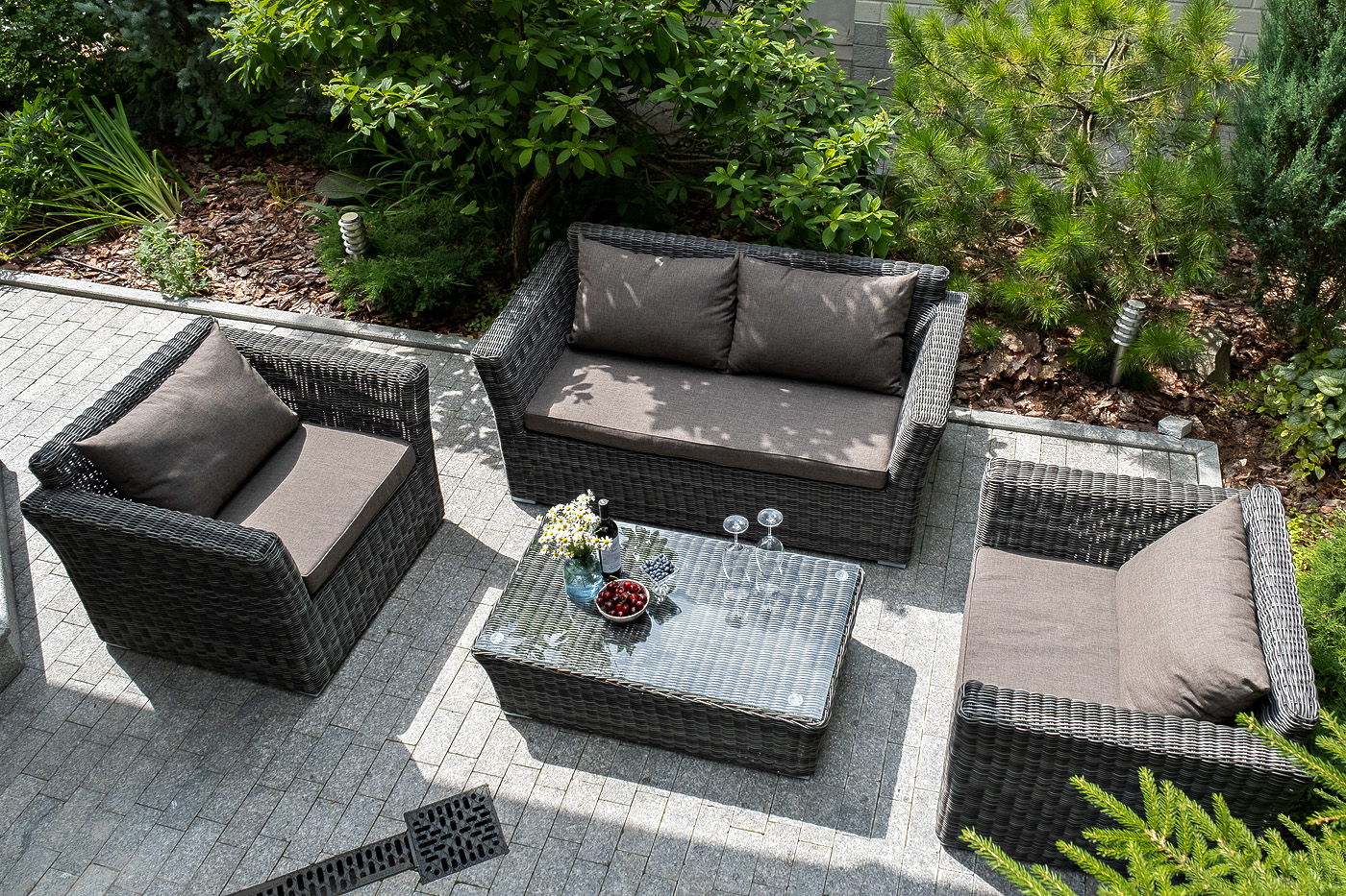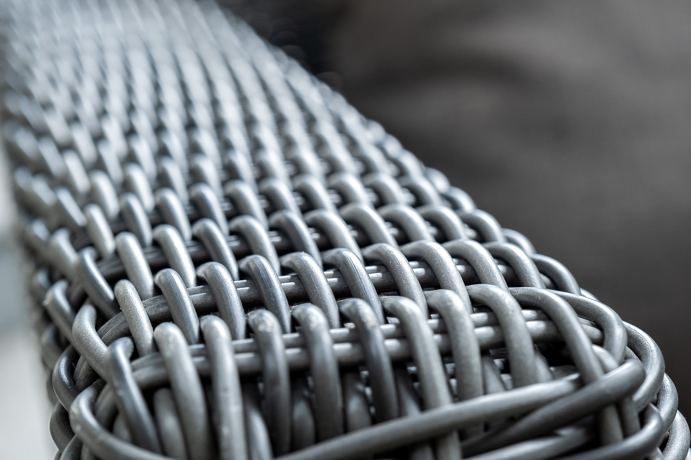 Диван выполнен из круглого искусственного ротанга графитового цвета, оплетенного вручную.