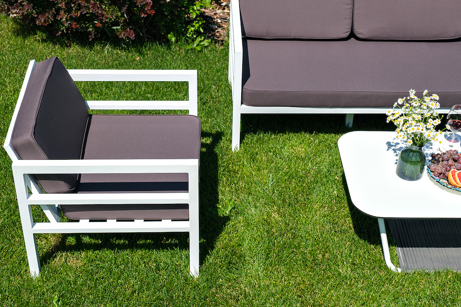 В комплекте на сидениях и спинке предусмотрены подушки контрастного темно-серого оттенка со съёмными чехлами. Строгое лаконичное кресло подходит для использования на открытом воздухе и в помещении, в том числе и в зоне повышенной влажности.