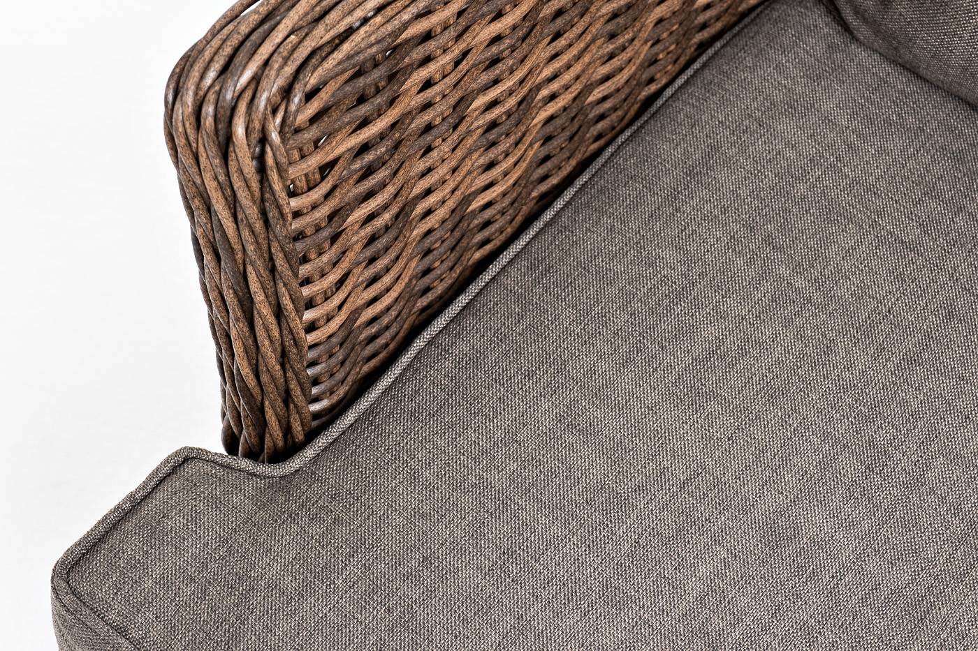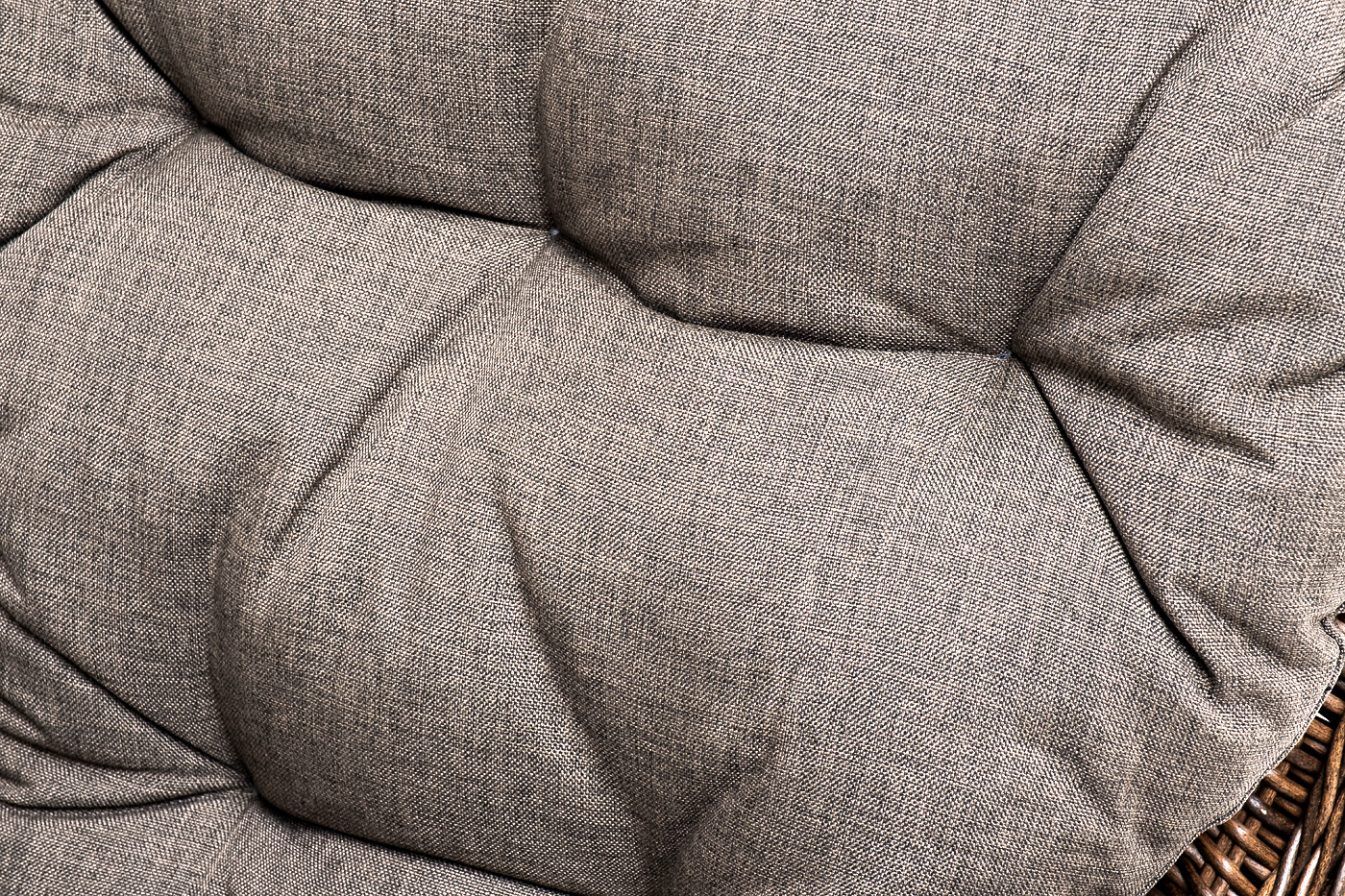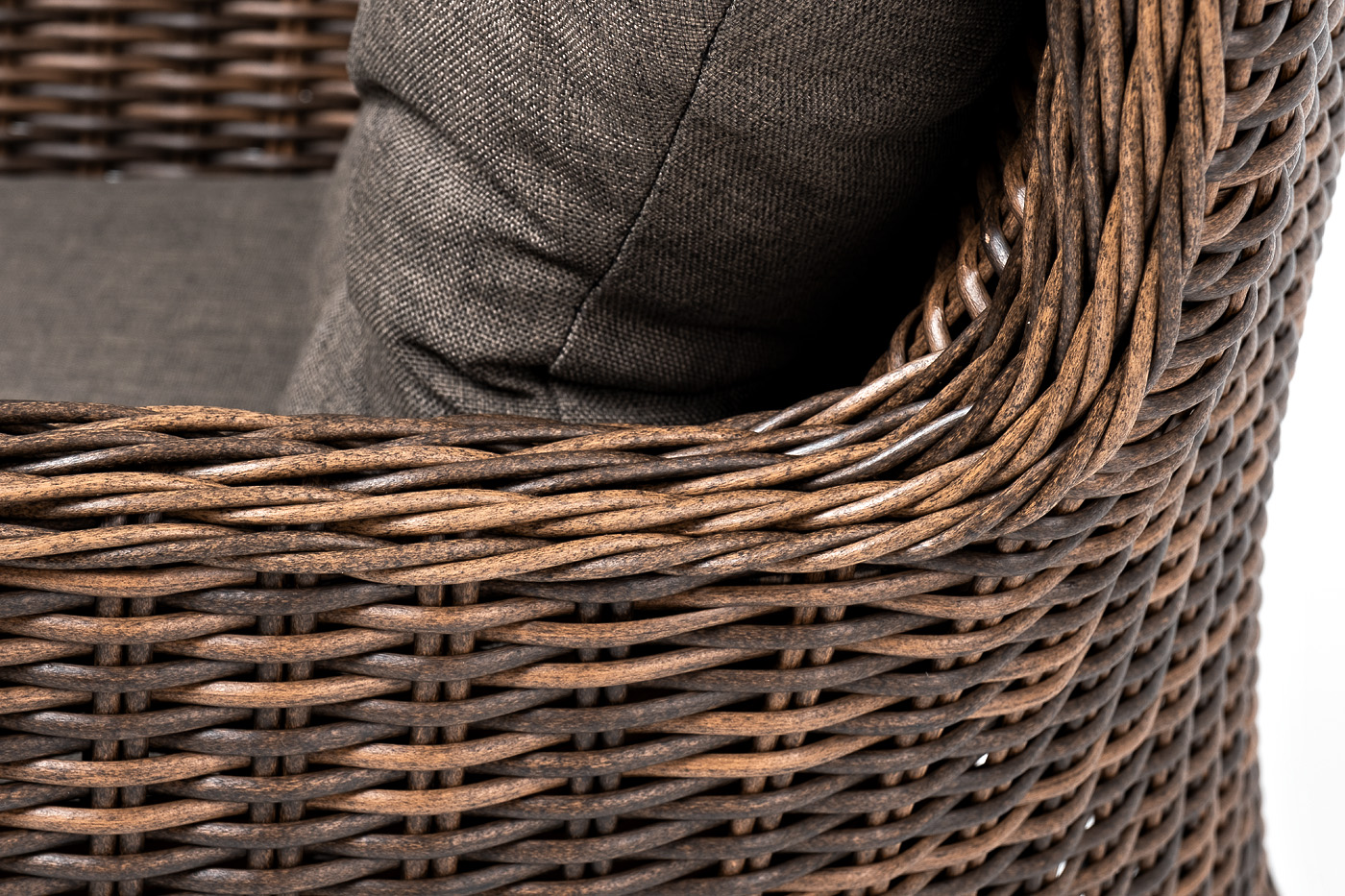 В садовое кресло укомплектовывается мягкими подушками. Они пошиты из износостойкого полиэстера серо-коричневого оттенка с плотностью 230гр/м2. Защитные свойства синтетического материала усиливаются благодаря влагоотталкивающей пропитке.