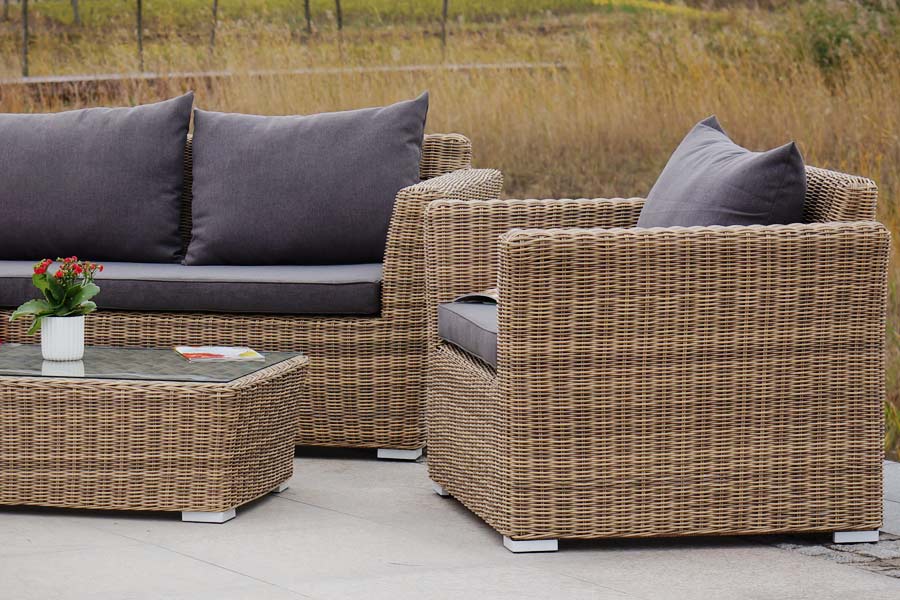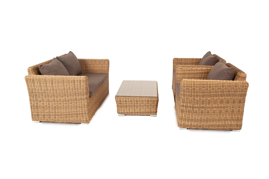 Прочный алюминиевый каркас усиливает устойчивость мебели. Его дополняет соломенная оплетка, которая представлена из круглого искусственного ротанга.