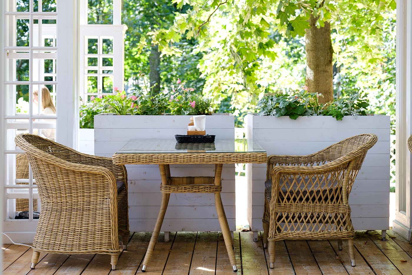 Каркас изготовлен из прочного алюминия, вручную оплетенного круглым искусственным ротангом натурального соломенного оттенка. В качестве столешницы использовано ударопрочное стекло, толщиной 5 мм. На стол можно ставить горячие тарелки и чашки, не опасаясь деформации покрытия.