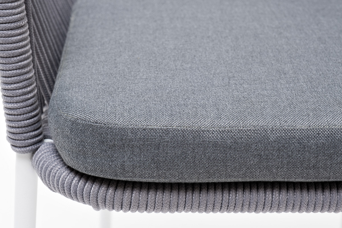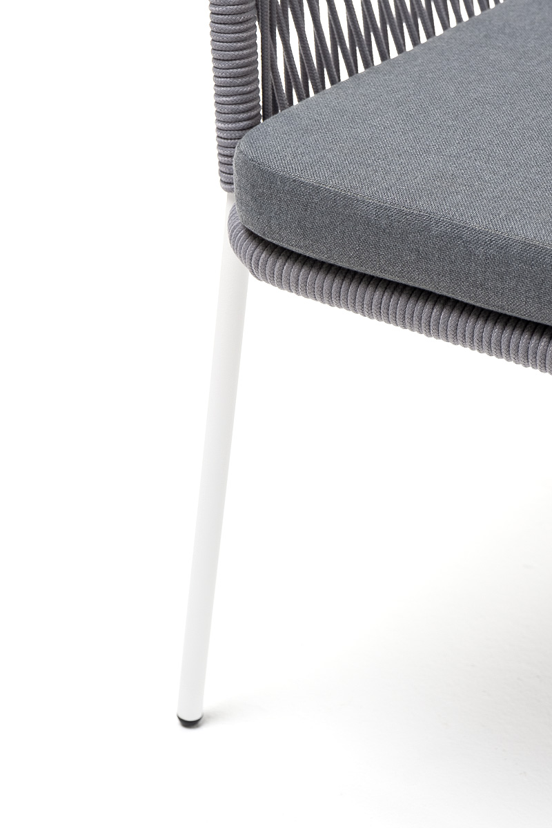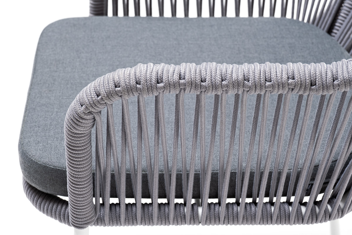"Лион" стул плетеный из роупа, каркас из стали белый муар, роуп светло-серый круглый, ткань светло-серая